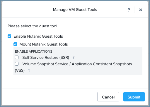 2. Choose Enable Nutanix Guest Tools, and Mount Nutanix Guest Tools.